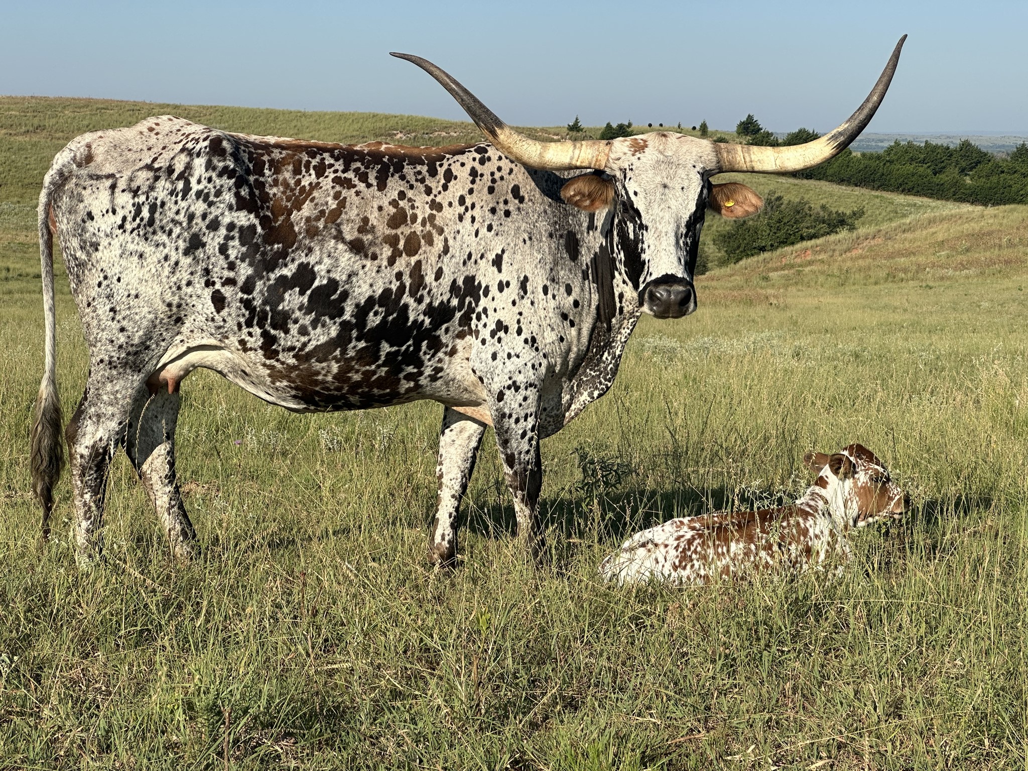 Victory Lap daughter out of one of our best White Dragon females, and she’s proving exactly why that cross works. We’re loving the color she throws—she’s become the talk of the pasture for good reason. Year after year she gives us some of the most striking, vividly colored calves out there, the kind you can spot from across the ranch. Currently carrying a Knight Shade spring calf.