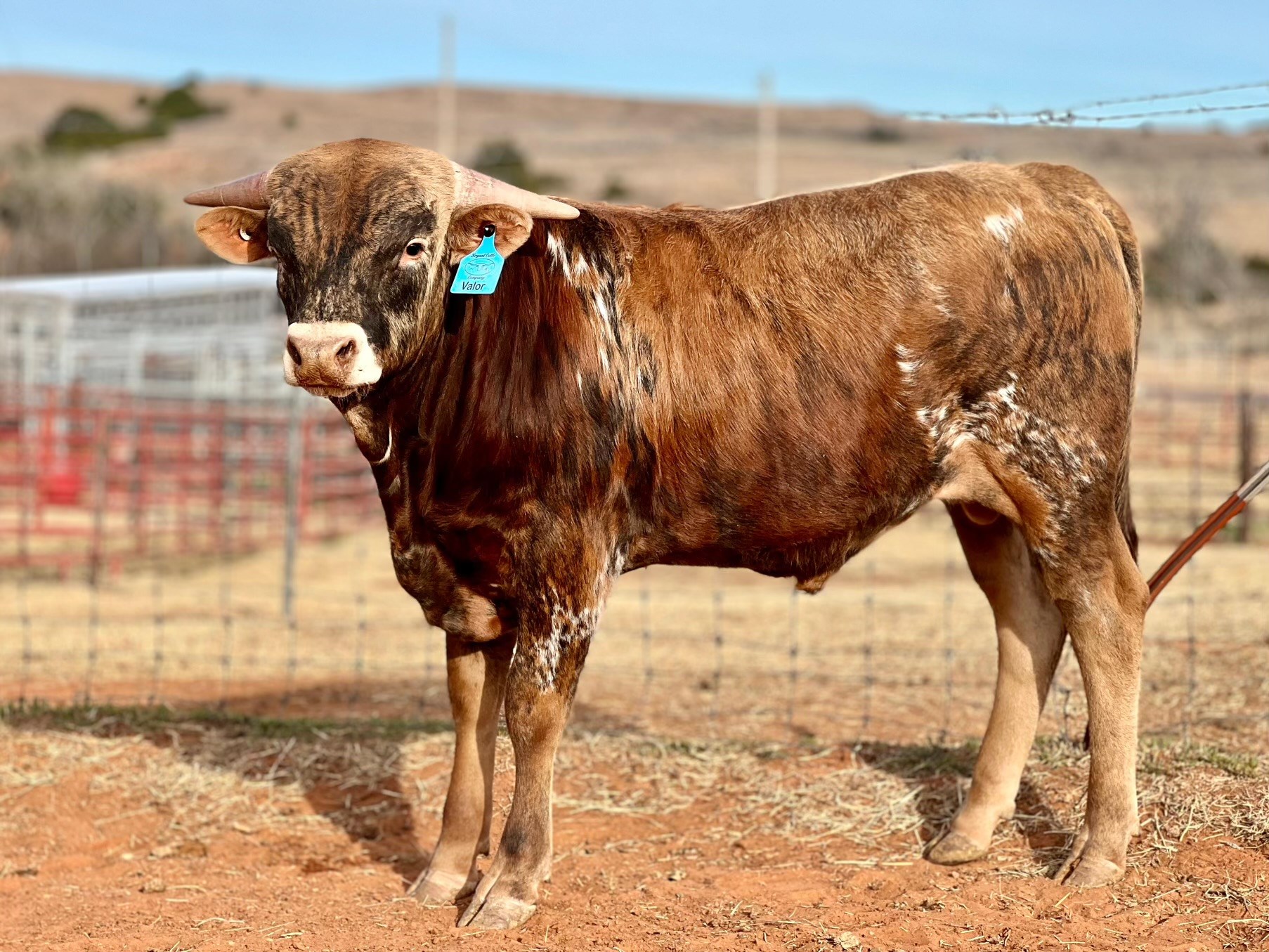 This remarkable young sire is destined for greatness! His dam boasts impressive measurements, exceeding 96 TTT and 109 TH, showcasing exceptional genetics. As the son of 50 Amp—an influential presence in the NLFR—he carries strong lineage and potential. His striking black and red brindle coat is already developing beautifully, and his horn placement, set far behind the poll, hints at a massive, commanding mature bull. A promising addition to any breeding program!