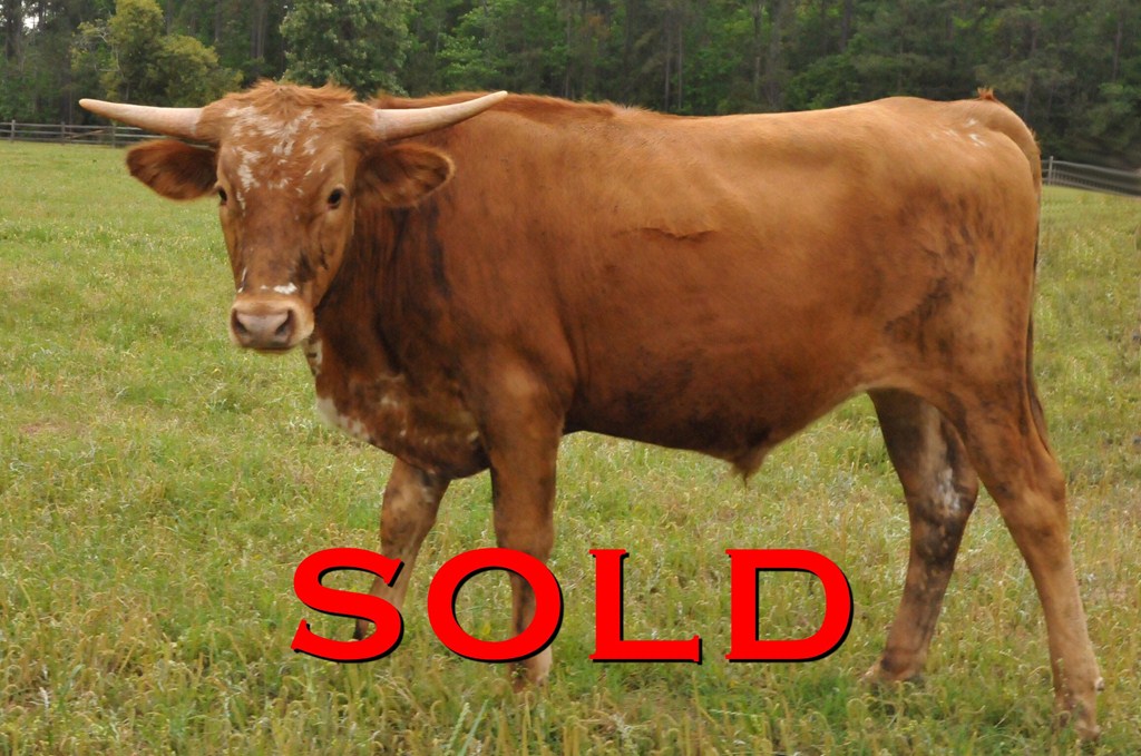 Brindle with white specs on face. Nice disposition; takes cubes from hand. Charming young steer, in process of being halter-broken.