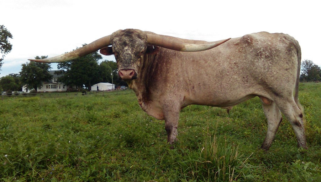 What an awesome young bull with laid back big swooping horn. What a pedigree. I love his roan color.