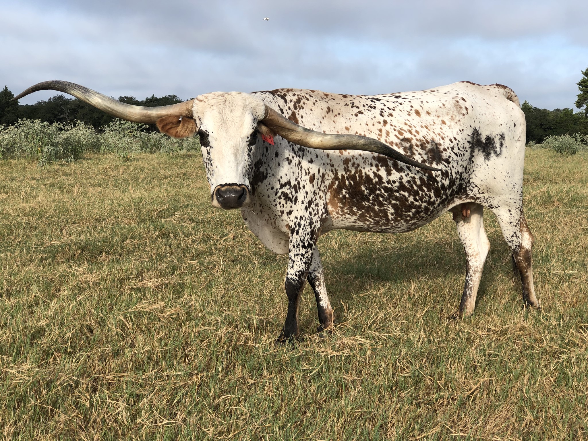This cow is a super producer! Her big bodied offspring have lateral twist and good dispositions. Her horn got bumped when she was young and fell slightly but kept growing
