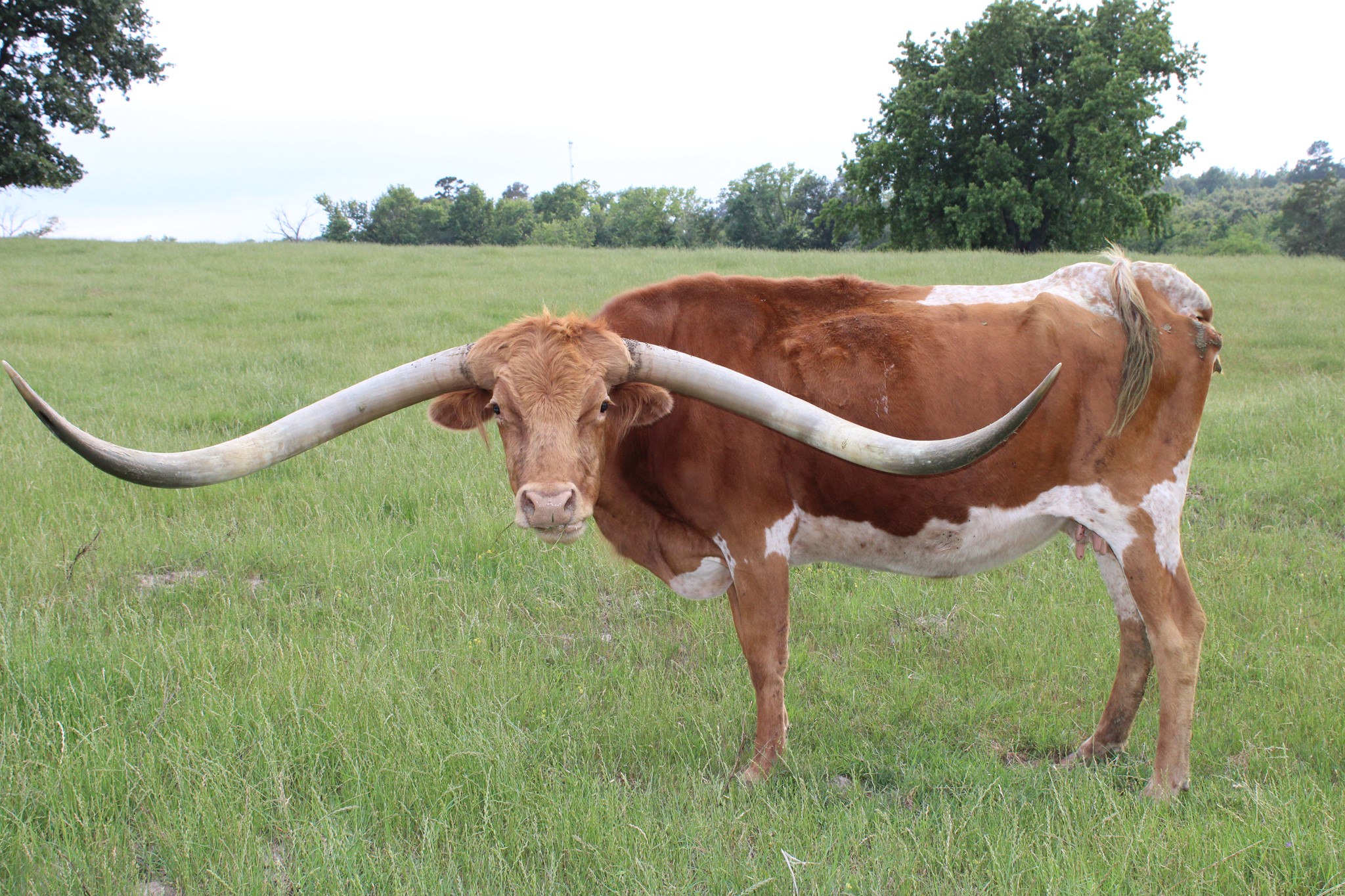 Beautiful longhorn momma with a ton of horn. She was purchased from Alan Sparger and currently has a Heartbreaker heifer at side. Will be the first one up for cubes